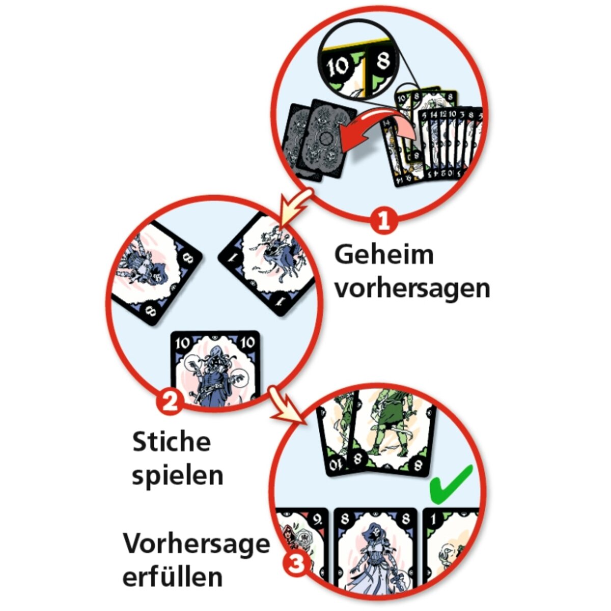 Vor jeder Stichrunde werden dafür zwei der eigenen Handkarten ausgewählt, deren Wert